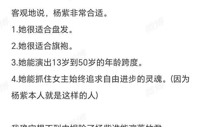 从年代气质角度来说,董竹君作为民国时期的传奇女性,身上既有传统女性的美德,又有新时代女性的意识觉醒,气质中融合了东方的含蓄内敛和西方的开放进取。 杨紫虽然是现代演员,但她演过的古装剧、民国剧和现代剧,已经证明了她能够准确把握不同年代角色的气质特征。 综上所述,杨紫饰演董竹君,虽然的确存在风险,但是,只要杨紫能深入研究董竹君的生平传记,做到真正理解这位传奇女性的精神世界,并且能去相关场景深入体验生活的话,杨紫不成功都难。