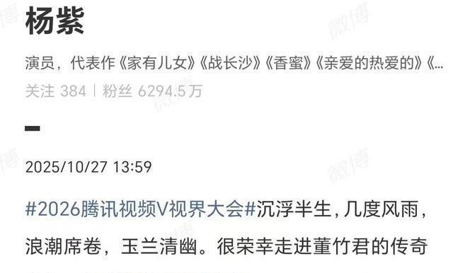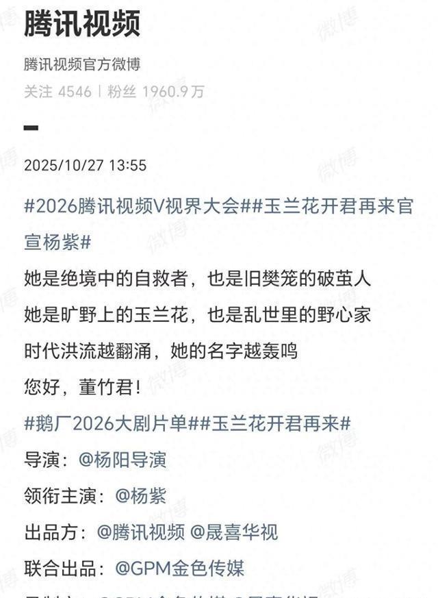 10月27日,年代女性传奇剧《玉兰花开君再来》官宣,演员杨紫确定在剧中饰演传奇大女主董竹君。
