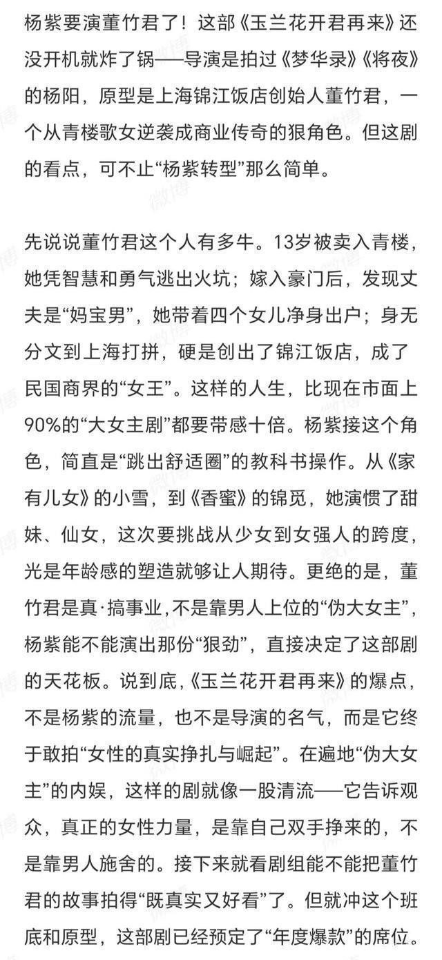 这次,杨紫确定在《玉兰花开君再来》中饰演董竹君后,话题立刻登上热搜,在观众中引发了广泛的关注和讨论。 大部分观众,尤其是杨紫的粉丝们,对杨紫出演董竹君,表达了强烈期待和极大信任,认为她是少数有能力且敢于承接这一挑战的演员。